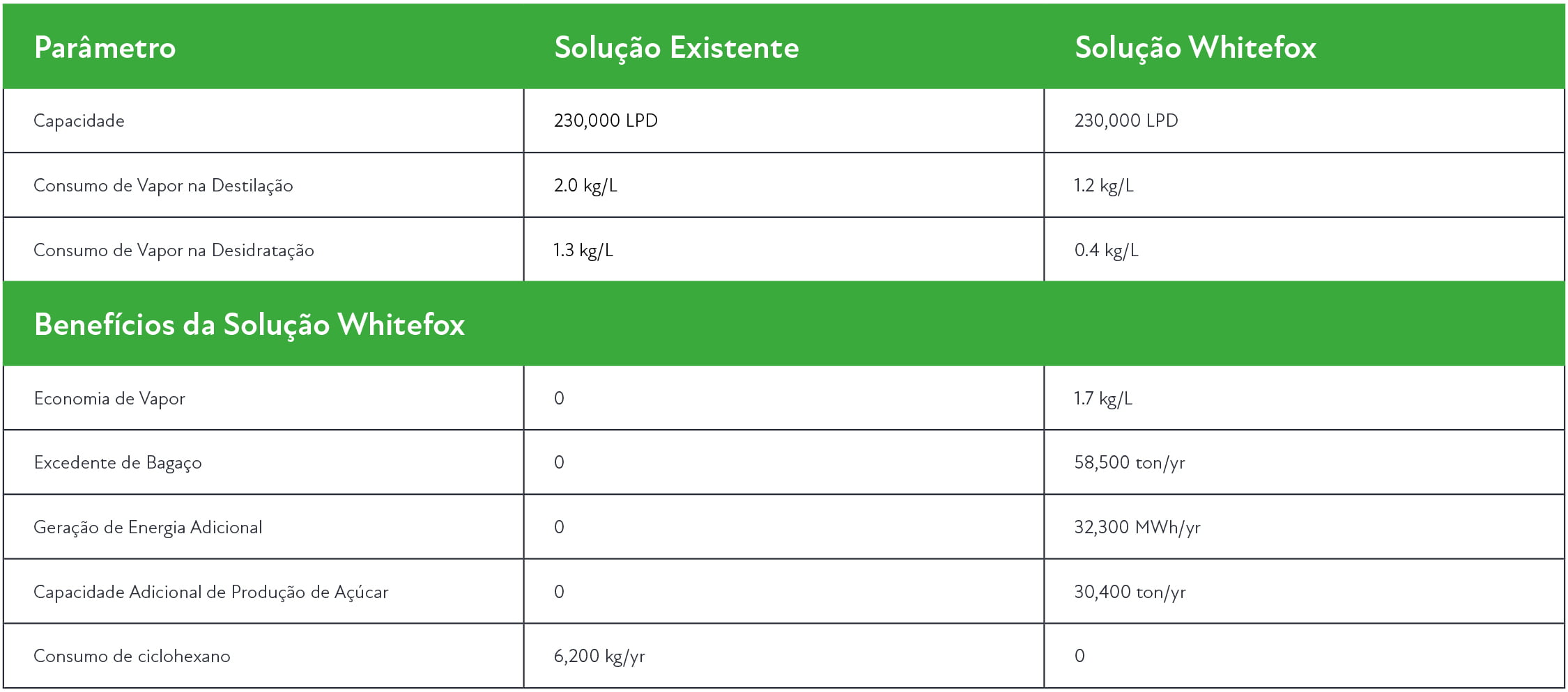 Em média, a desidratação convencional na produção de etanol de cana-de-açúcar requer aproximadamente 5kg de vapor para cada litro de etanol destilado isso é 4 vezes mais do que produzir etanol anidro com a solução de membrane da Whitefox.